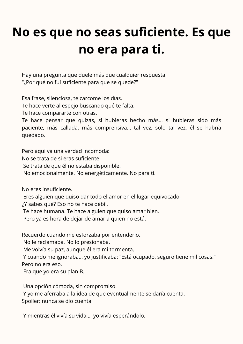 Incluye ejercicios, frases, playlist y herramientas para sanar sin perder tu esencia. Más de 4000 palabras que te acompañan mientras eliges dejar de insistir donde ya no hay amor.